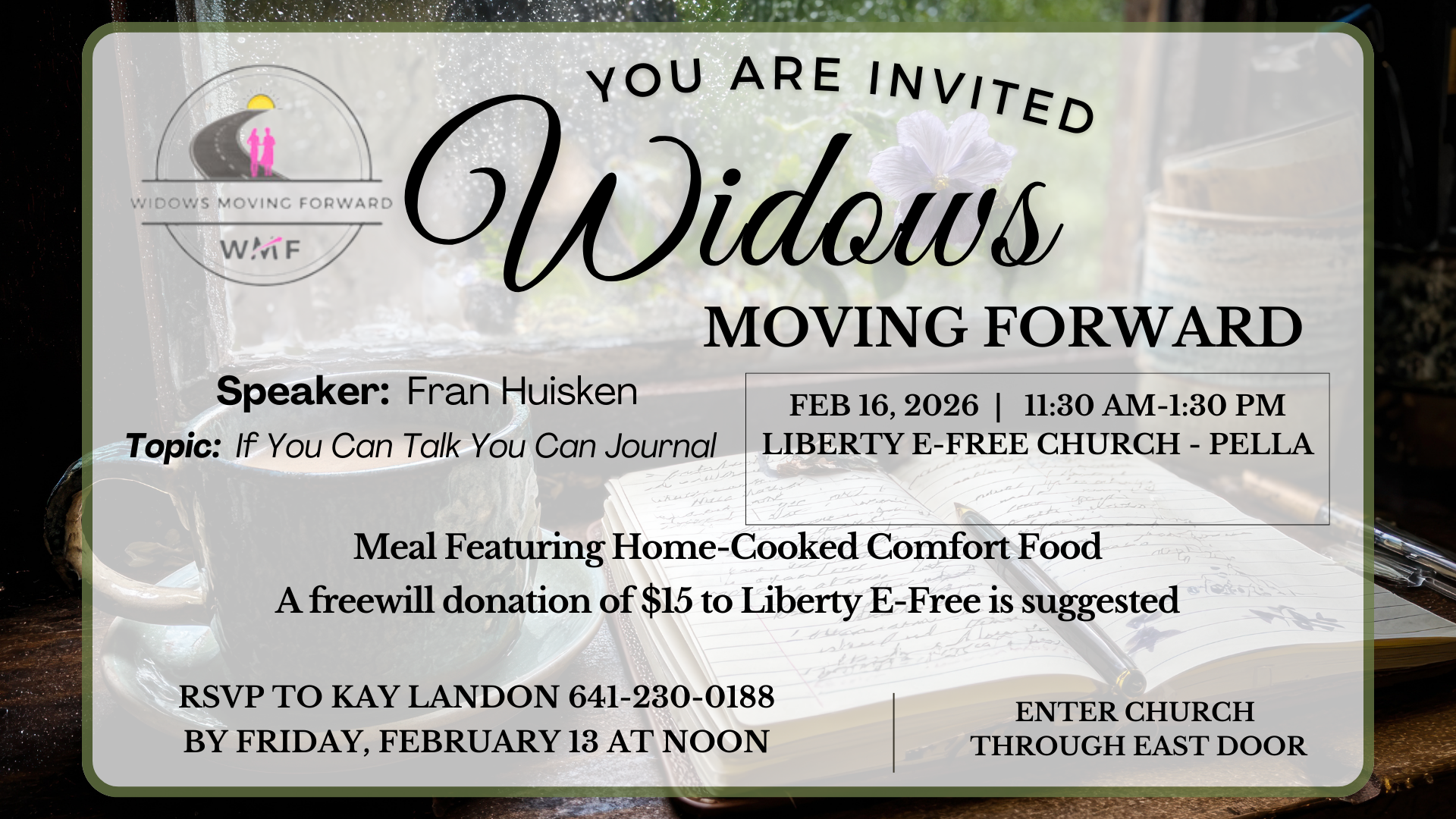 Widows Moving Forward Ministry typically meets on the 3rd Monday of the Month at Liberty E-Free Church. A new theme will be introduced each month. Some months will include a speaker, while other months will focus on fellowship.